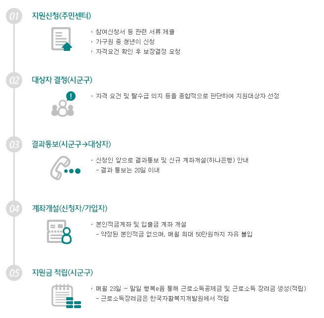 신청 당시 가구 전체의 총 근로 사업 소득이 기준 중위소득 40%의 60% 이상인 일하는 생계 의료급여 수급가구가 가입할 수 있는 통장으로 매우러 본인 저축액에 따라 지원되는 정부 지원금을 탈수급 시 지원 받을 수 있습니다.