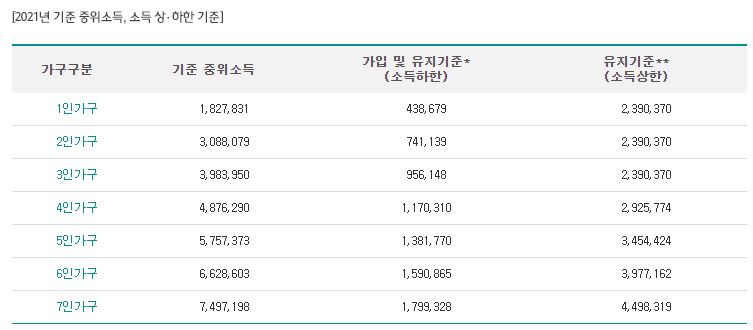 ▶ 가입 및 유지기준(소득하한)이란 희망키움통장을 가입 및 유지가 가능한 소득의 하한 수준을 의미합니다. 가구 전체의 소득인정액이 소득하한을 초과하지 않을 경우 가입할 수 없습니다.